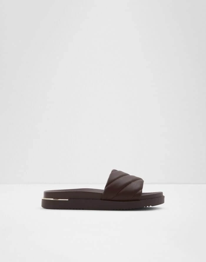 #Style notes *The quilted finish and subtle metal detail of these sleek slides add the perfect touch of chic to an otherwise laidback silhouette. #Details * Colour Dark Brown