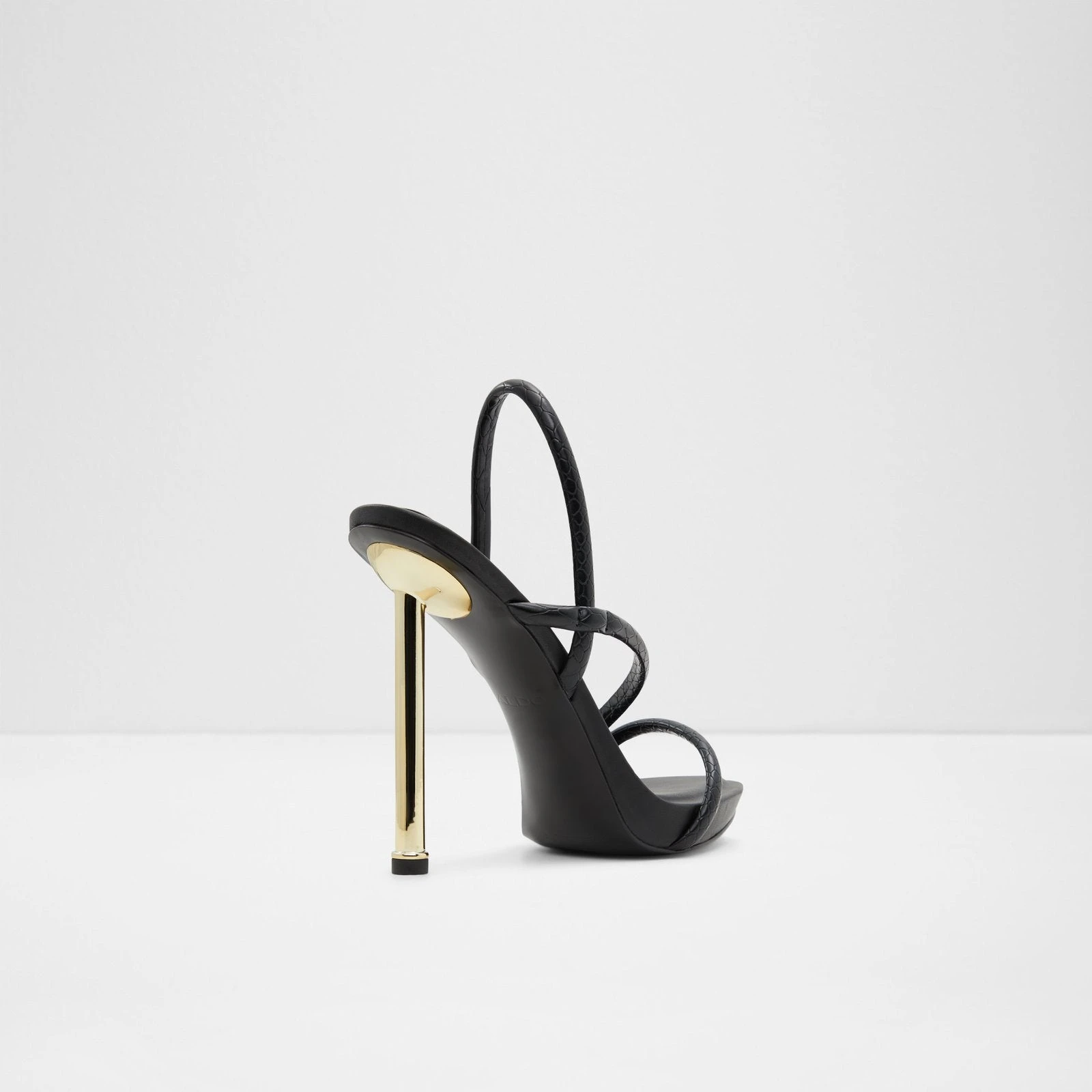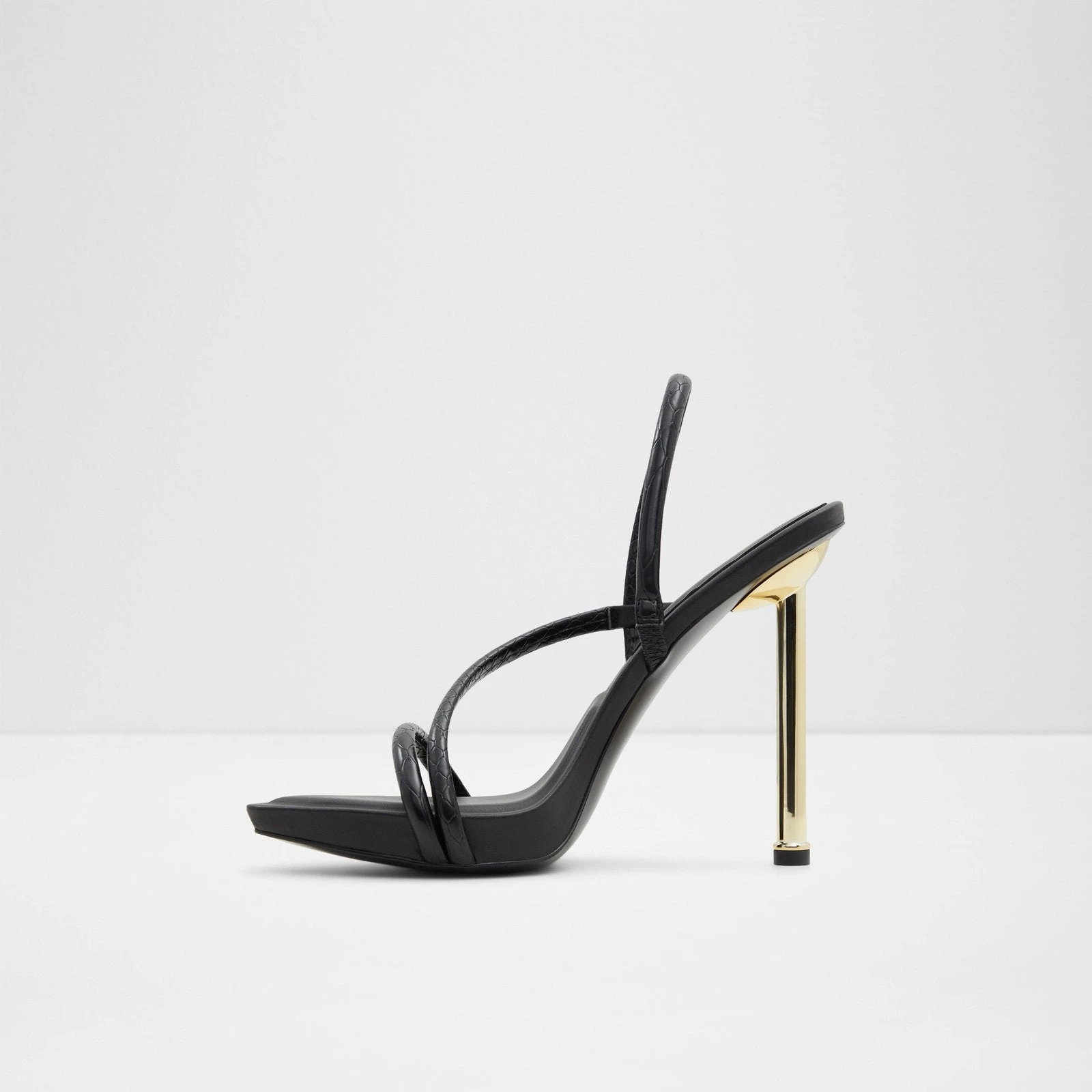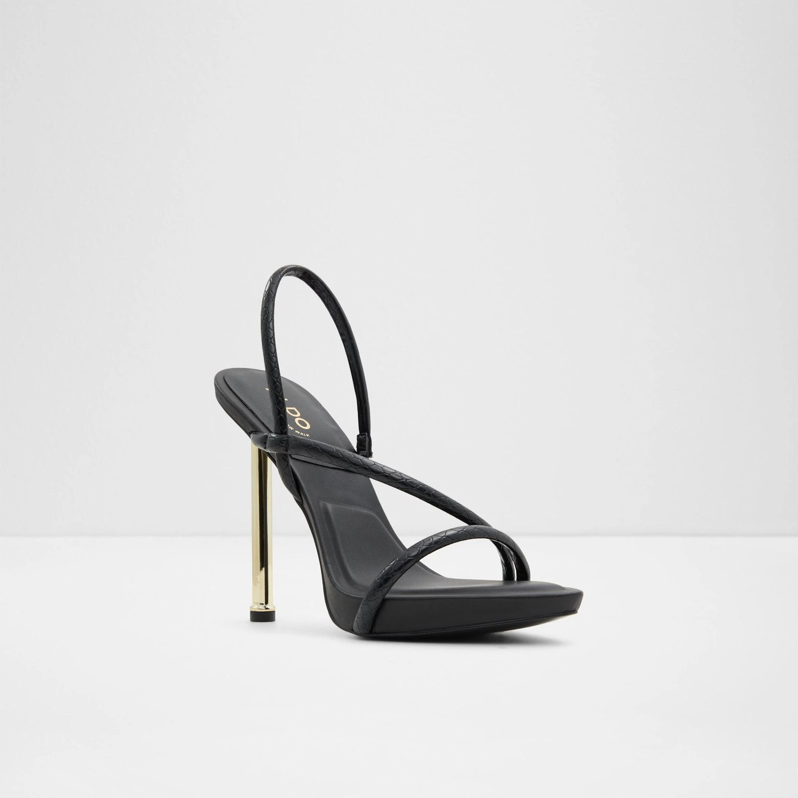 #Style notes *The striking heel of these strappy standouts were made for every and any occasion. #Details * Sling back heeled sandal * Peep toe * Slip-on * Colour Black #Materials *Upper: Synthetic *Main: Snake skin *Sole: Rubber #Measurements *Heel height: 4.25 cm