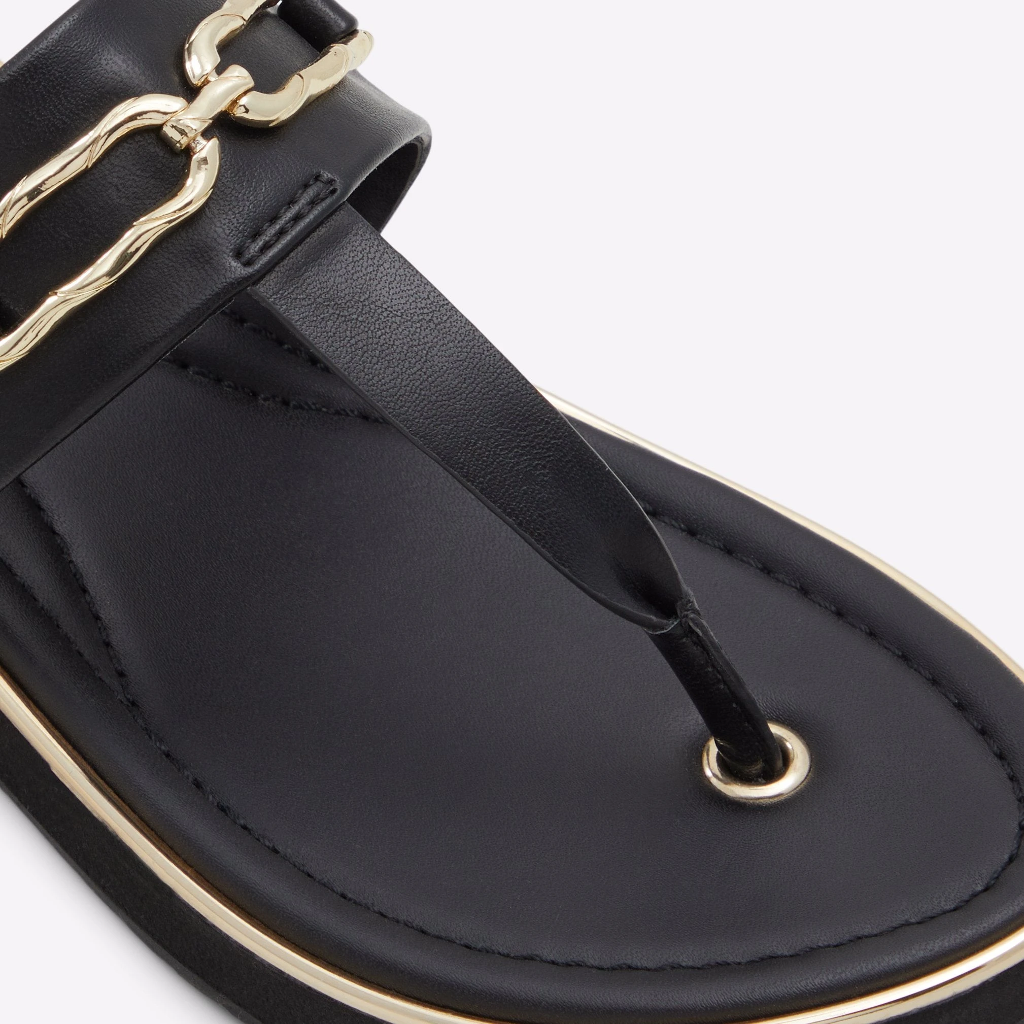#Style notes * The perfect summer sandal, with a T strap and gold details you will be wearing this all season long. #Details * T-strap sandal * Open round toe * Slip on * Metal ornament * Colour Black #Materials *Upper: Synthetic *Main: Smooth *Sole: Rubber #Measurements *Heel height: 0.75 inches *Platform height: 0.5 inches