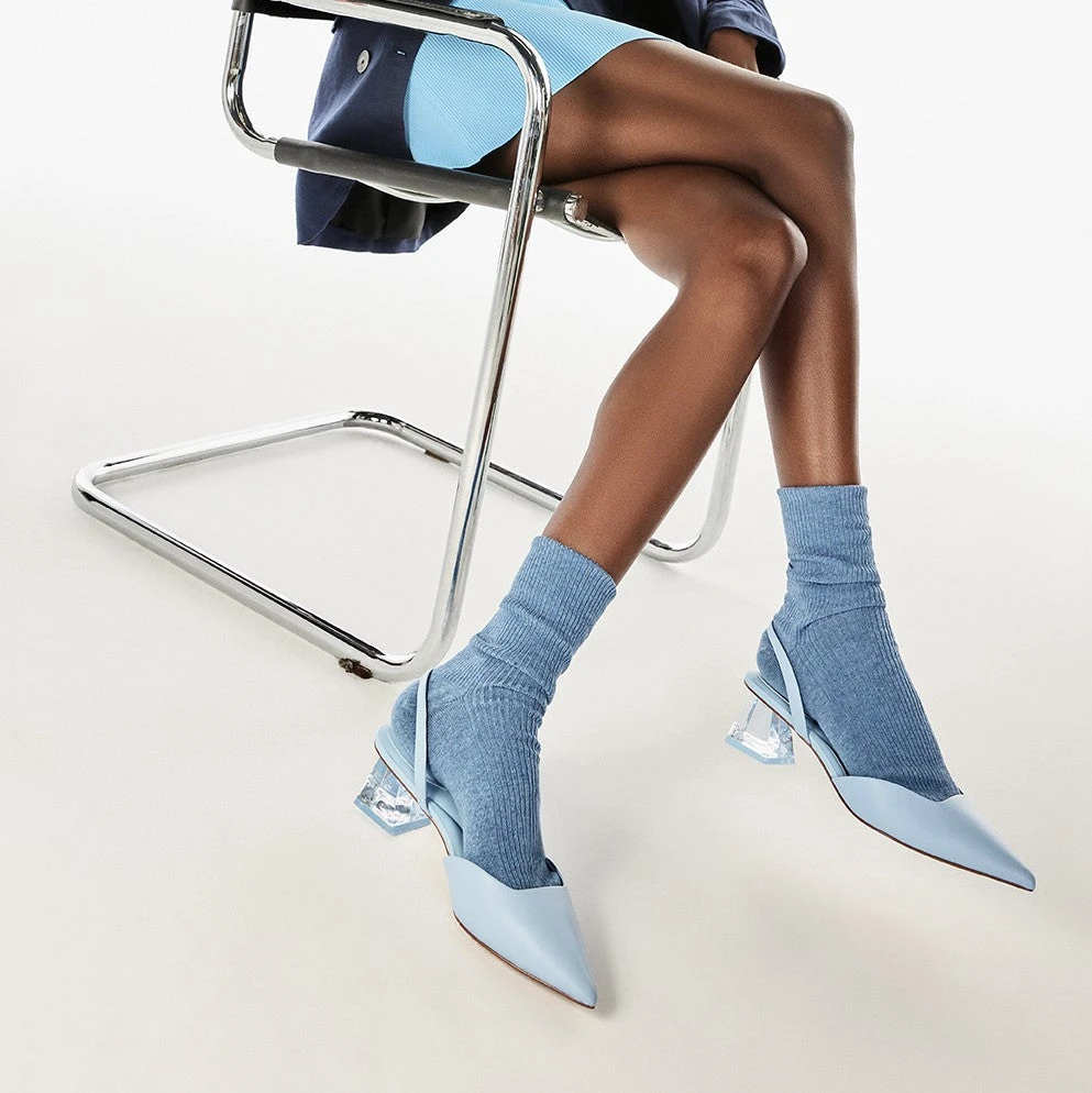 #Style notes * Whatโs that unexpected pop of style that keeps our classic leather Malaga slingback, au courant? Itโs all in that chic little architectural heel. #Details * Sling back high heel * Closed pointy toe * Slip-on * Colour Blue #Materials *Upper: Leather *Main: Smooth *Sole: Rubber #Measurements *Heel height: 5.0 cm