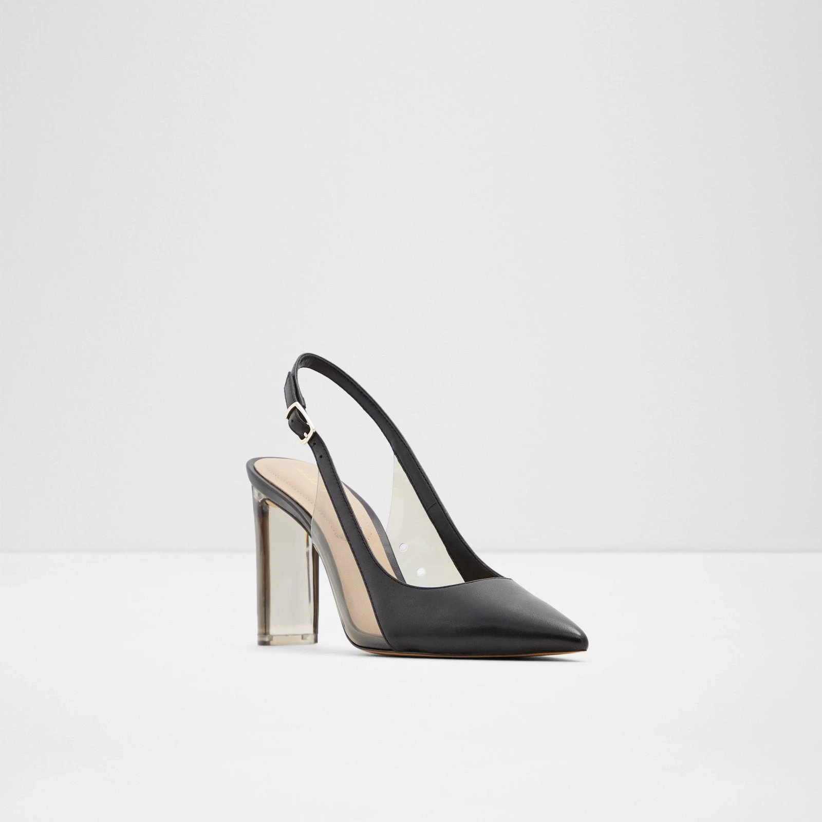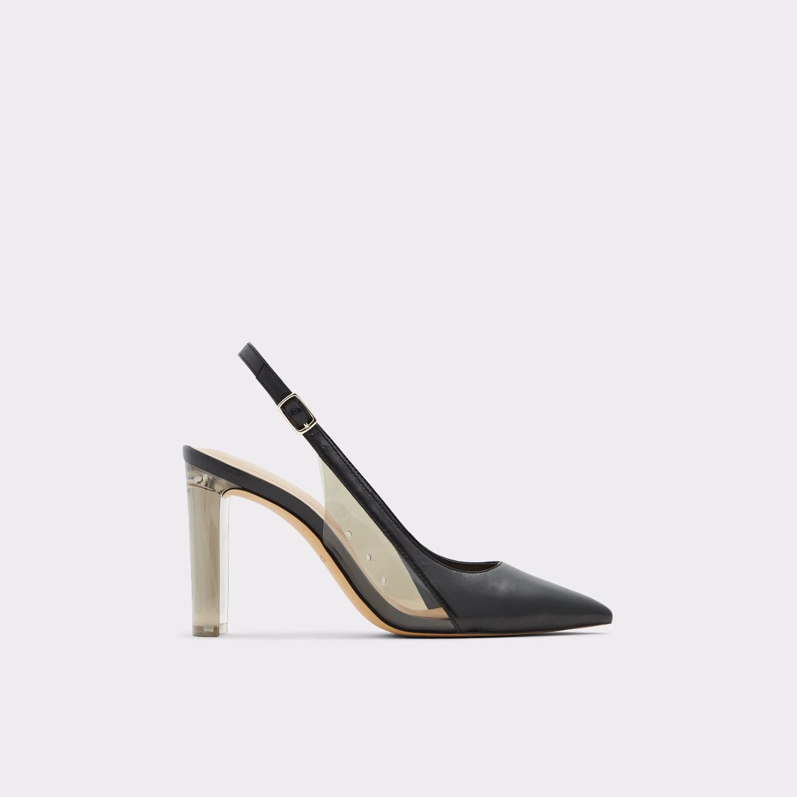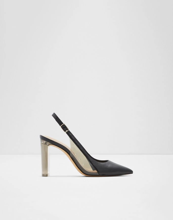 #Style notes *With a see-through cutout vamp and semi-transparent lucite heel, these stiletto slingback court shoes are clearly a fashion-forward addition to your closet. #Details * Sling back high heel * Pointy toe * Block heel * Buckle closure * Colour Black #Materials *Upper: Leather *Sole: Rubber #Measurements *Heel height: 7.5 cm