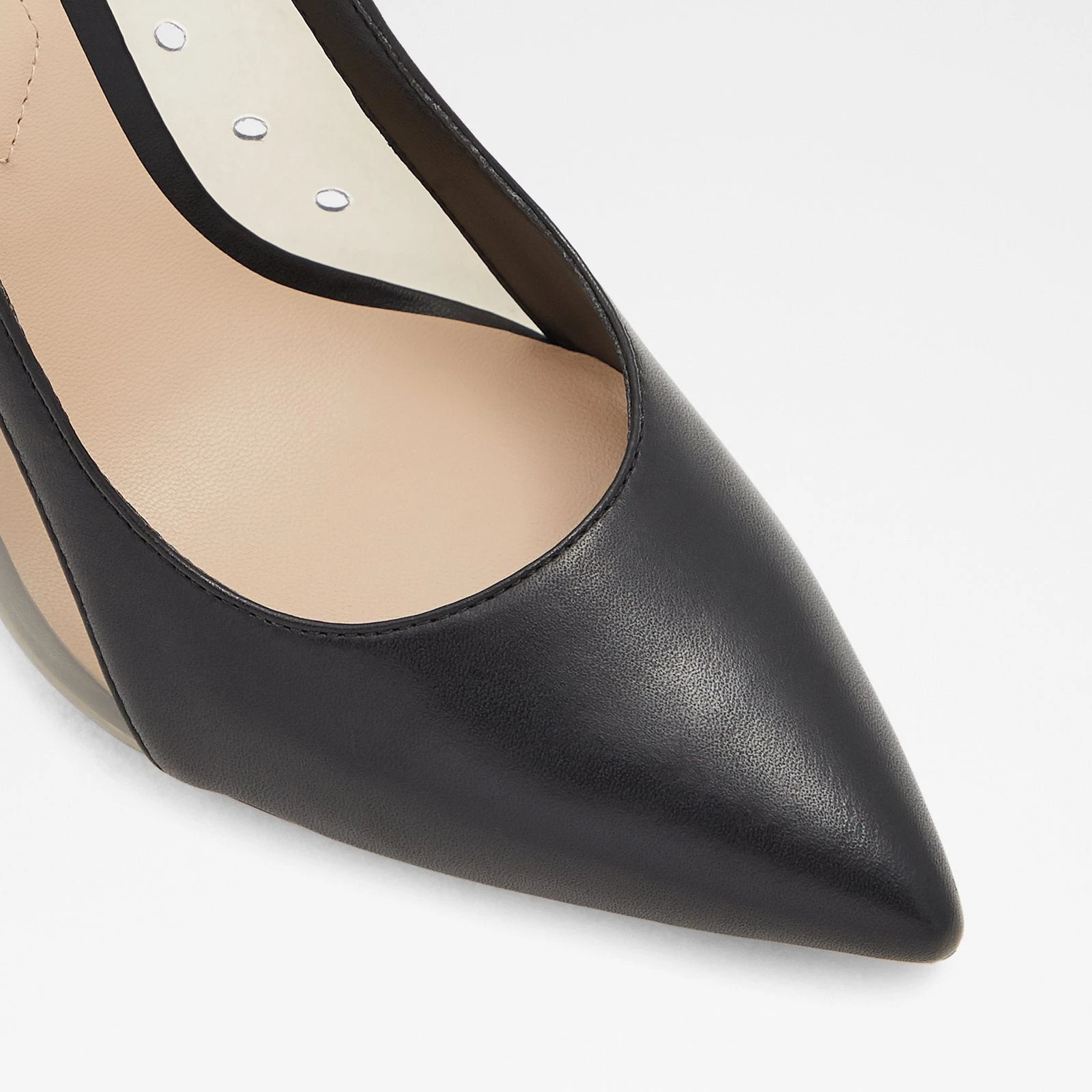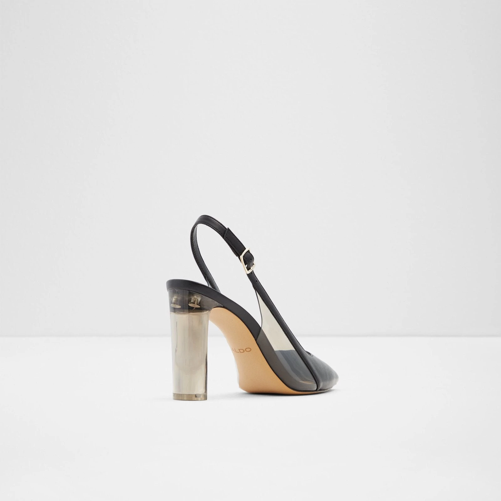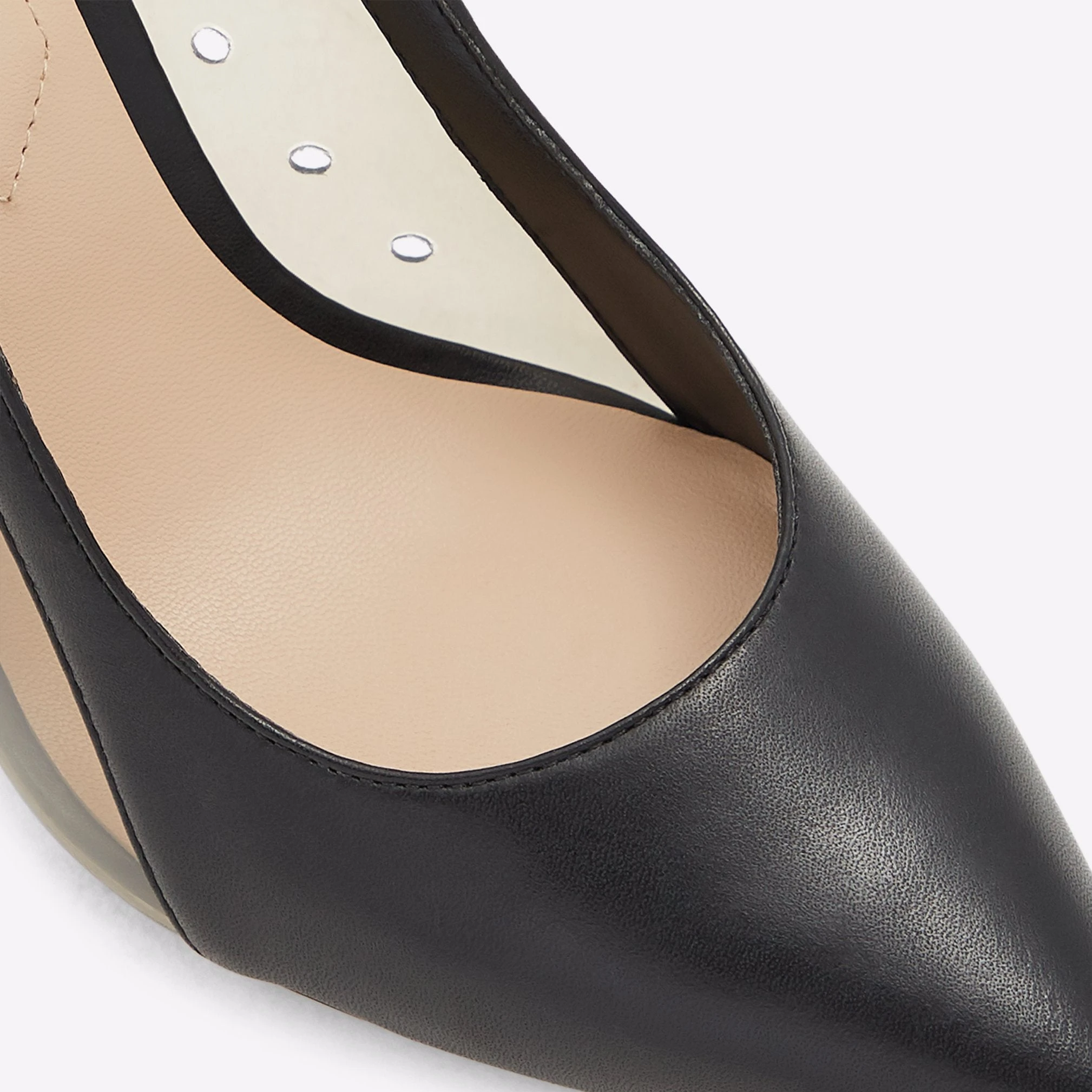 #Style notes *With a see-through cutout vamp and semi-transparent lucite heel, these stiletto slingback court shoes are clearly a fashion-forward addition to your closet. #Details * Sling back high heel * Pointy toe * Block heel * Buckle closure * Colour Black #Materials *Upper: Leather *Sole: Rubber #Measurements *Heel height: 7.5 cm