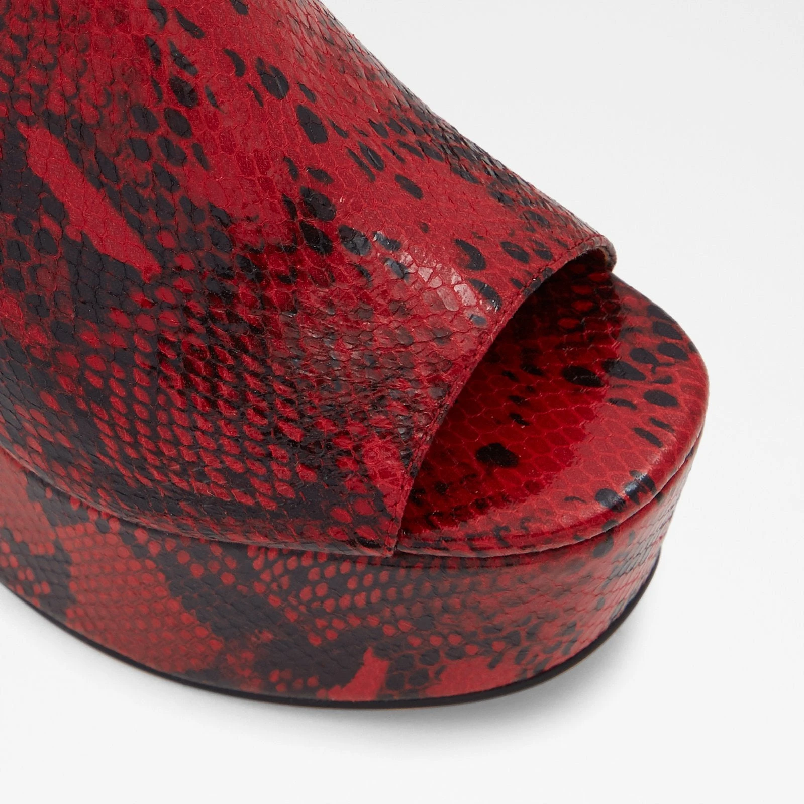 Stomping out the fashion trends season after season, soaring platform shoes continue to parade down the runways. This vibrant red faux snakeskin platform sandal balances a peep toe, ultra-high block heel, and adjustable slingback strap.
