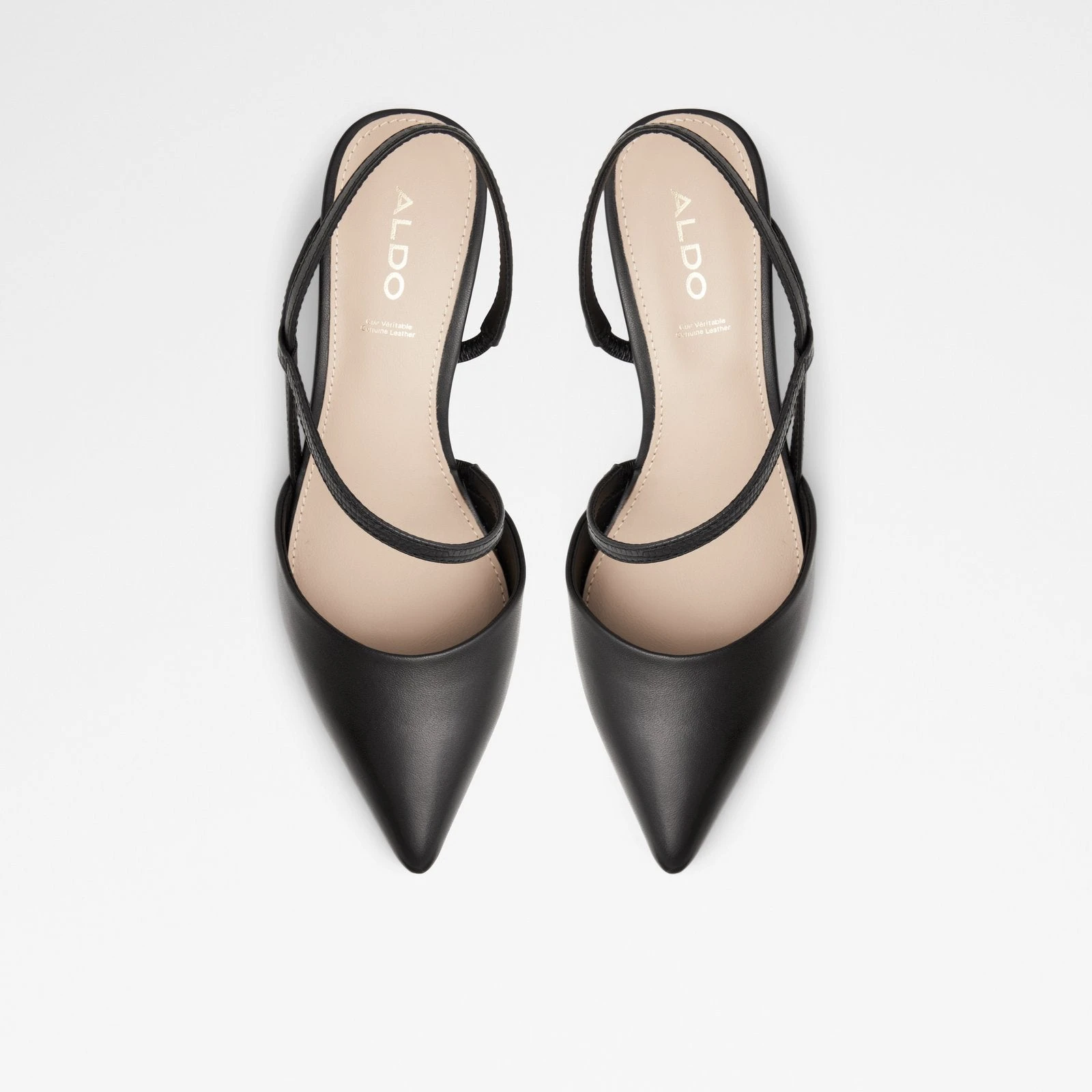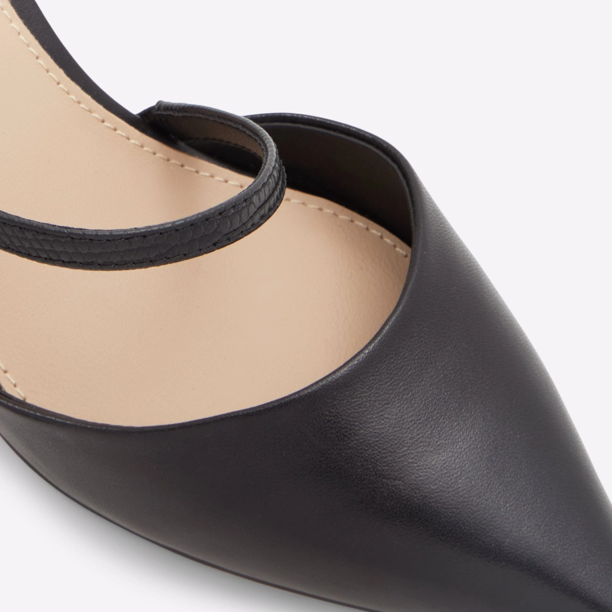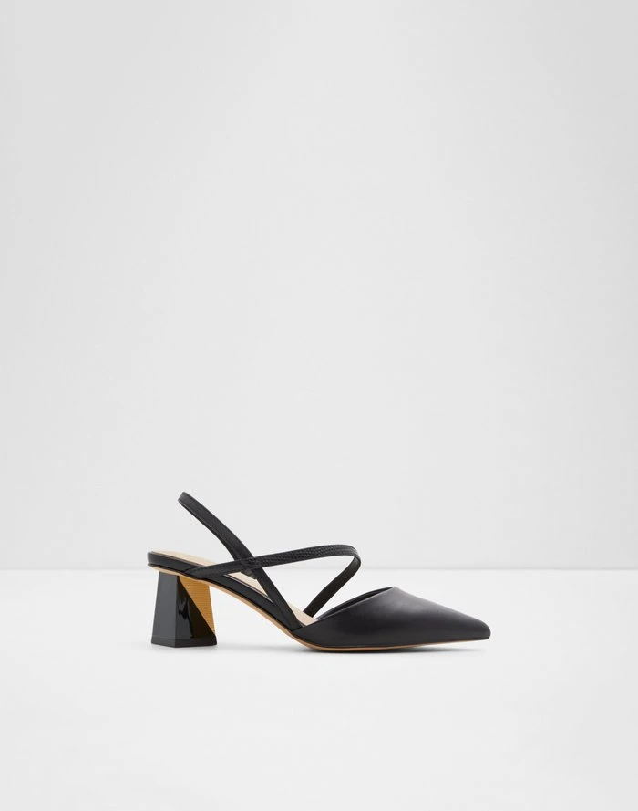 #Style notes *Featuring a unique block heel design, these dainty strappy heels are absolute stunners. #Details * Sling back high heel * Closed pointy toe * Slip-on * Colour Black #Materials *Upper: Leather *Main: Mixed materials *Sole: Rubber #Measurements *Heel height: 2.0 cm